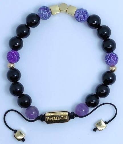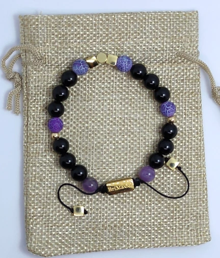 Esta pulsera contiene;Amatista: potencia la memoria y mejora la motivación, facilita el proceso de toma de decisiones, disipa la ira, la furia, el miedo y la ansiedad; Obsidiana Negra: para aliviar la tensión y absorbe las energías negativas del entorno.