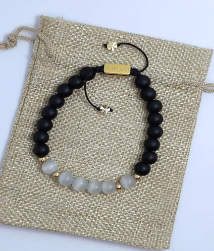 Esta pulsera contiene Ojo de Gato: da confianza, serenidad, felicidad y buena suerte.