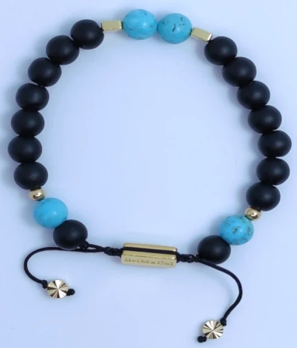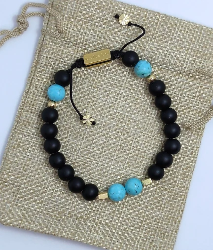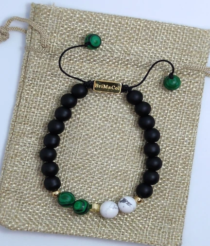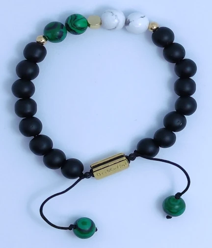 Esta pulsera contiene;Malaquita: aporta equilibrio y armonía, abre al amor incondicional, anima a cambiar y a asumir riesgos; Agata: aporta equilibrio físico, emocional e intelectual, estimula recuerdos, sana la ira interna; Turquesa Blanca: mejora la comunicación y la facilidad de palabra, aumenta la capacidad creativa del pensamiento.