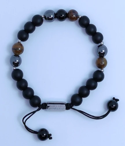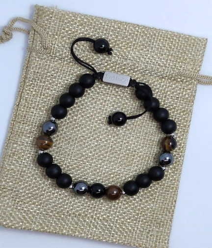 Esta pulsera esta formada por; Ojo de Tigre: para la autoconfianza, voluntad, coraje y valentía; Hematita Negra: para concentrar la fuerza y las energías positivas que llevamos dentro; Obsidiana Negra: para aliviar la tensión y absorber las energías negativas del entorno.